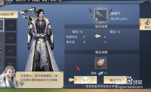 点击箭头所指的强化来强扮装备,不外前提是有足够的材料。