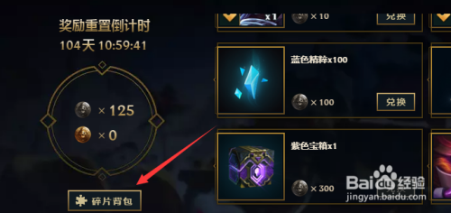领取完魂罗赏银,就可以在红色箭头所指的“碎片背包”,查看本身兑换的碎片有几多,达到所需要的碎片就可以去兑换英雄皮肤、图标、紫色宝箱和钥匙碎片。
