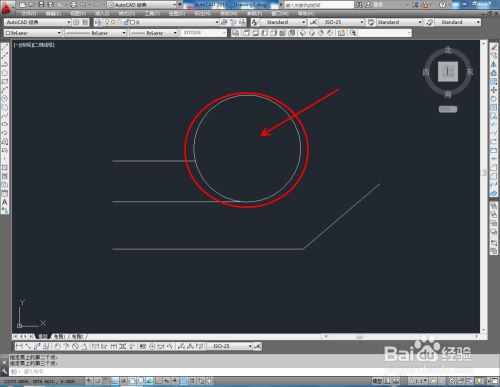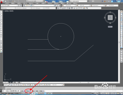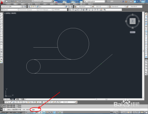 点击【圆东西】,鼠标点击下方号令栏中的【两点(2P)】,按图示确定好圆的两个点的位置后,按下空格键将圆绘制出来(如图所示);