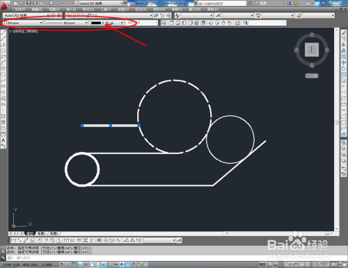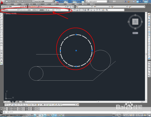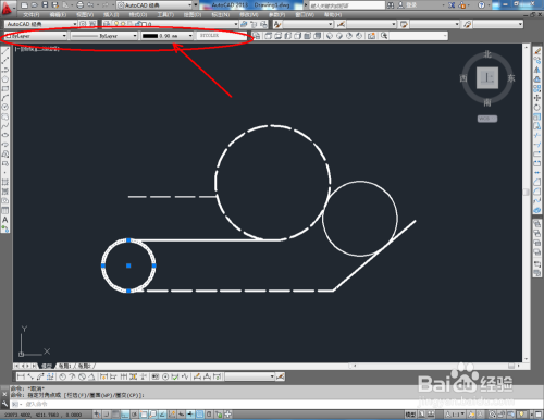 选中几个圆形图案,别离对特征栏中圆形的线型、线宽等参数进行设置(如图所示);