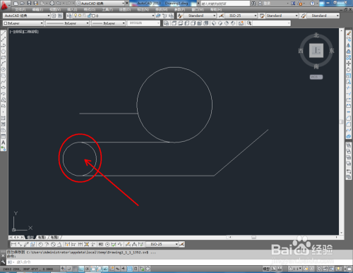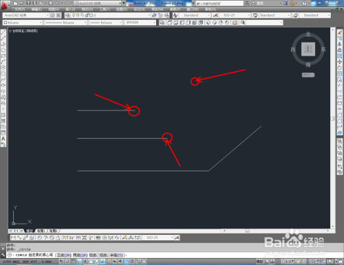 点击【圆东西】,鼠标点击下方号令栏中的【三点(3P)】,按图示确定好圆的三个点的位置后,按下空格键将圆绘制出来(如图所示);