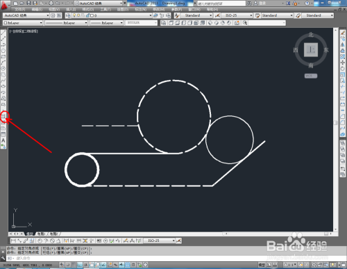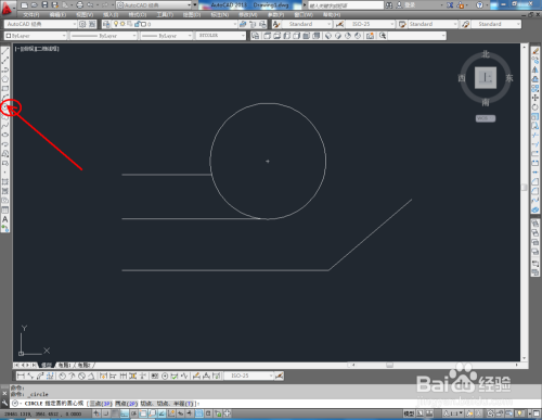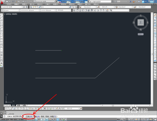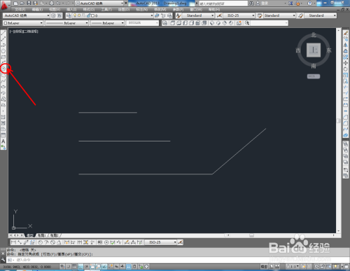 打开AutoCAD2013软件,点击【直线东西】,按图示在作图区域绘制几条线段;