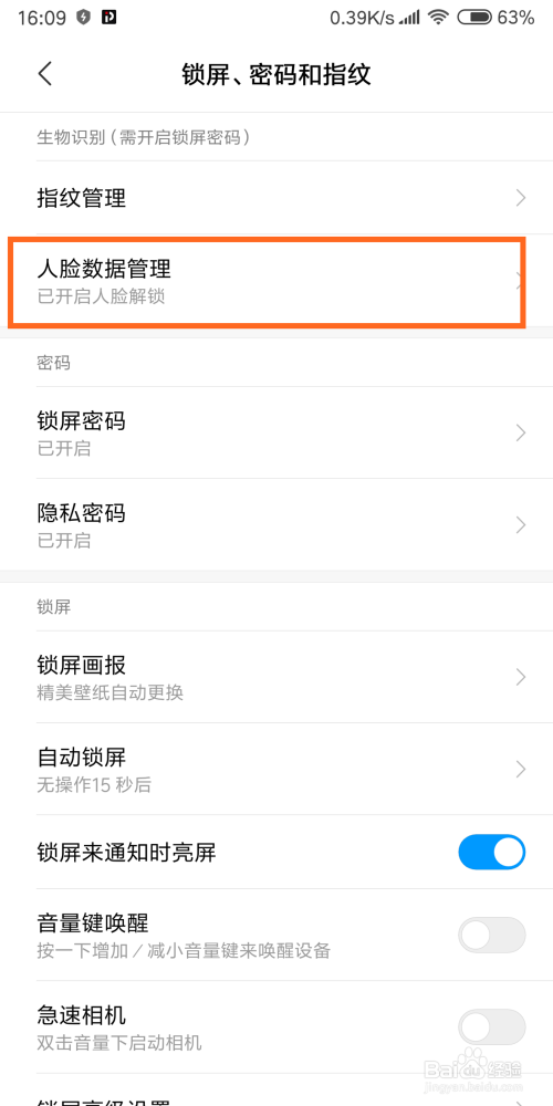 进入后,点击锁屏、密码和指纹选项。