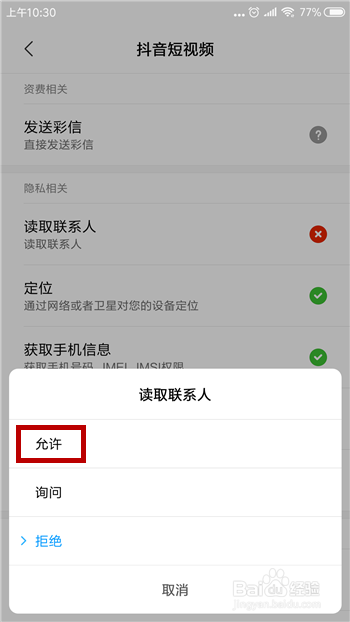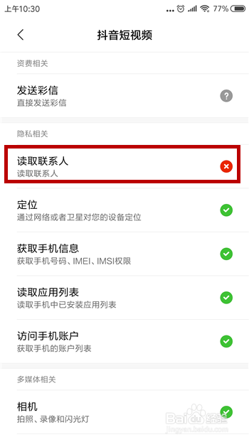 在抖音的权限设置中找到【读取联系人】权限并点击。