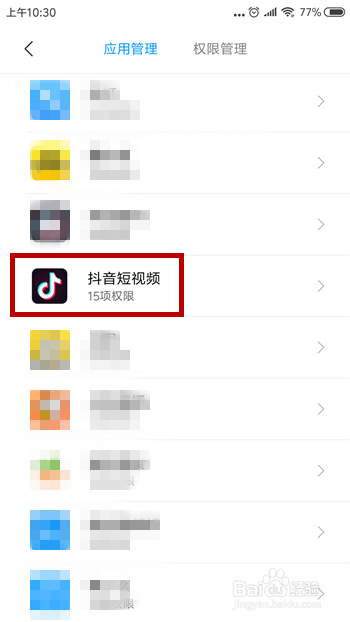 然后在应用办理中找到【抖音短视频】并点击打开权限办理界面。