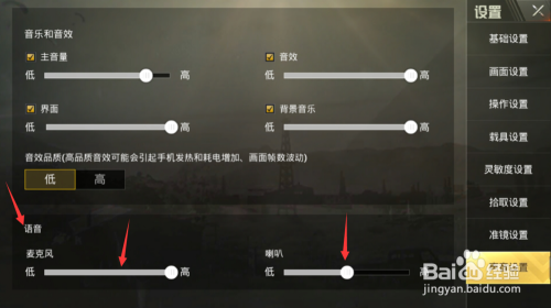 声音设置中语音项,若是带耳机游戏声音年夜可以调麦克风音量大小,若是外放游戏音量年夜调喇叭音量。(此设置合用于减小音量利用)