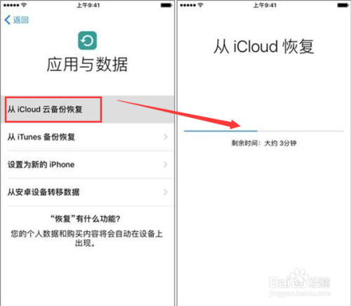 接着重启手机后,会进如应用数据阶段,然后我们可以点击“从iCloud云备份恢复”就可以啦;