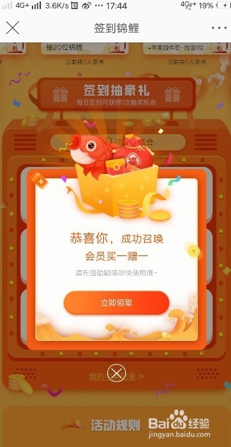 我抽中了一个会员买一赠一,点击【当即领取】。
