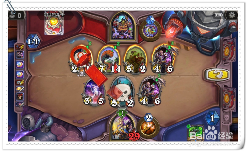 第六步,先用5/2冰暴怒者,将对面的2/1战利品换失落,并为敌手抽出一手牌。接着,利用手中的治疗波,给对方的7/14摩天龙加血。