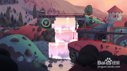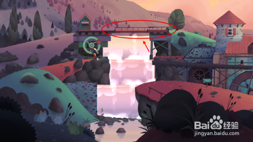 将紫色的道路往下拖,然后节制白叟走上桥梁后,然后一向往右走。