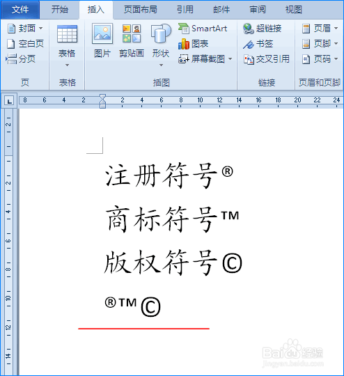 2、接着我们按住键盘上的“Ctrl”+“Alt”+“R”键,这时文档中就呈现了注册符号。如图所示: