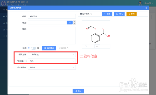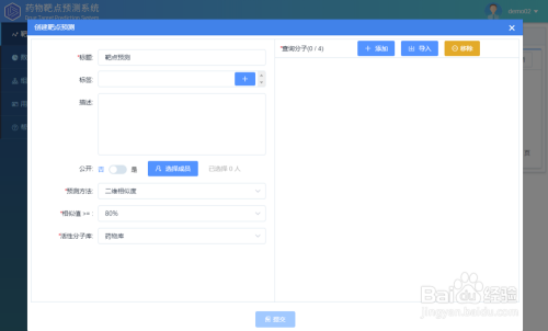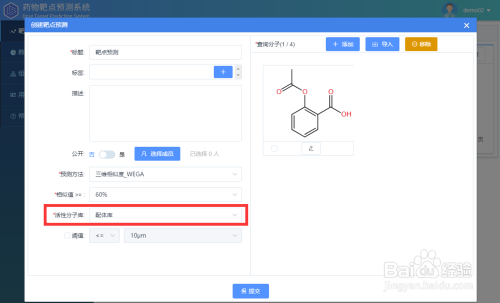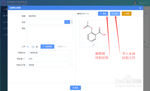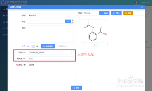 进入系统后,点击建立,弹出使命建立框。有图可见,使命建立包罗绘制/导入布局、选择展望方式、相似值及活性分子库等参数。
