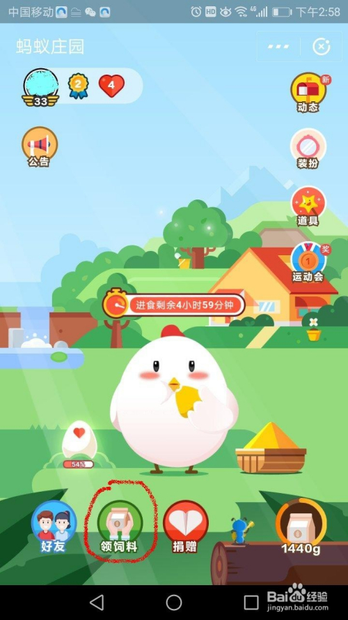 养小鸡首先要有饲料,点击“领饲料”你可以看见几种获取饲料的方式。