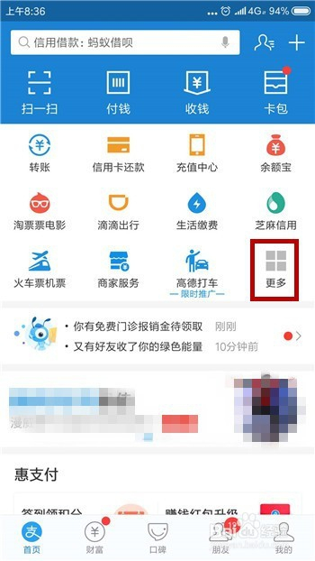 打开了付出宝后在顶部位置找到【更多】选项并点击打开应用界面。