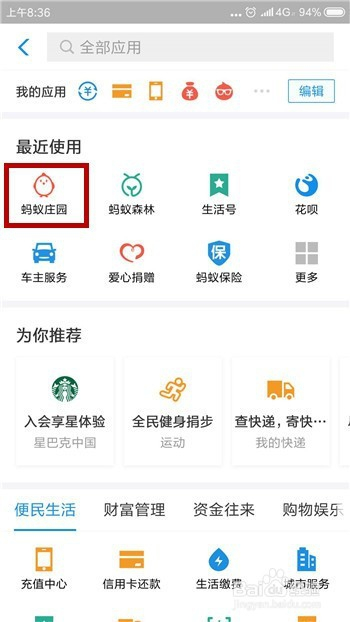 在应用界面中的比来利用下方找到并点击【蚂蚁庄园】。