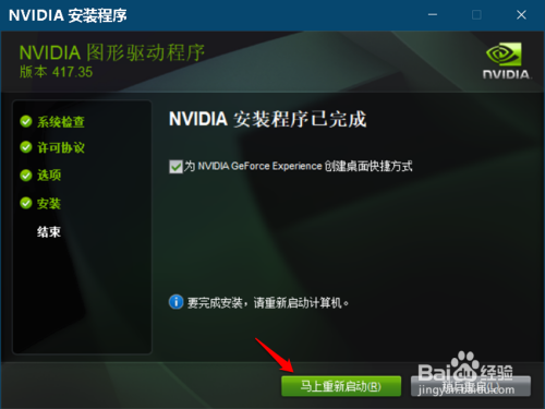 NVIDIA安装法式 - 图形驱动法式安装已完当作,我们点击:顿时从头启动;