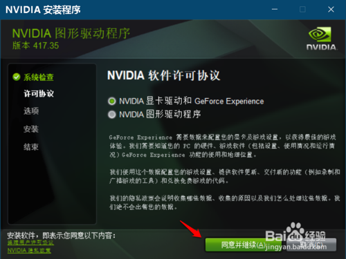 NVIDIA安装法式 - 兼容性查抄完当作后,打开 NVIDIA 软件许可和谈,点击:赞成并继续;