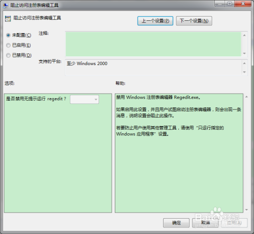 双击“阻止拜候注册表编纂东西”项,打开设置装备摆设窗口;