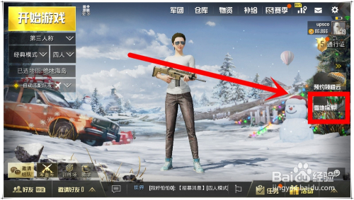 首先,大师打开刺激战场,登录脚色,来到游戏年夜厅,在界面右侧有一个“雪地摸索”的按钮,点击。