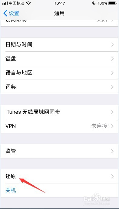 进入通用之后,将页面滑到最下面,可以看到有一个“还原”的菜单,点击进入,可以对一些功能进行还原设置,也就是出厂设置,如图所示。