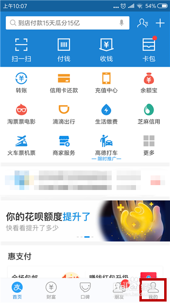其实免花呗分期的手续费可以利用蚂蚁积分兑换,在付出宝中点击右下角【我的】。