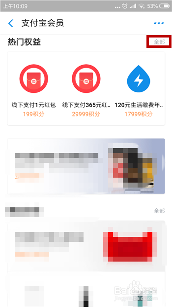 打开了付出宝会员后下拉界面,在热点权益的下方点击【全数】。