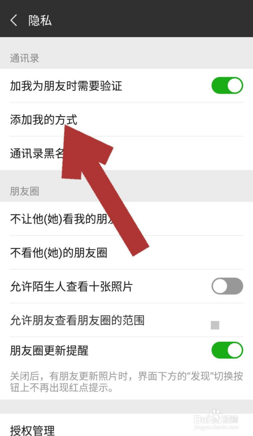 进入微信的隐私设置页面后,点击“添加我的体例”一栏,进入添加我的体例页面。