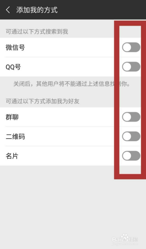 要想让别人彻底无法添加我们,就要把添加我的体例页面中所有体例后方的开关头都封闭,点击绿色开关,变为灰色即封闭完当作,如许别人搜不到我们了,即使在微信群可以看到我们,或者有别人发给他我们的手刺,他也是加不了我们的。