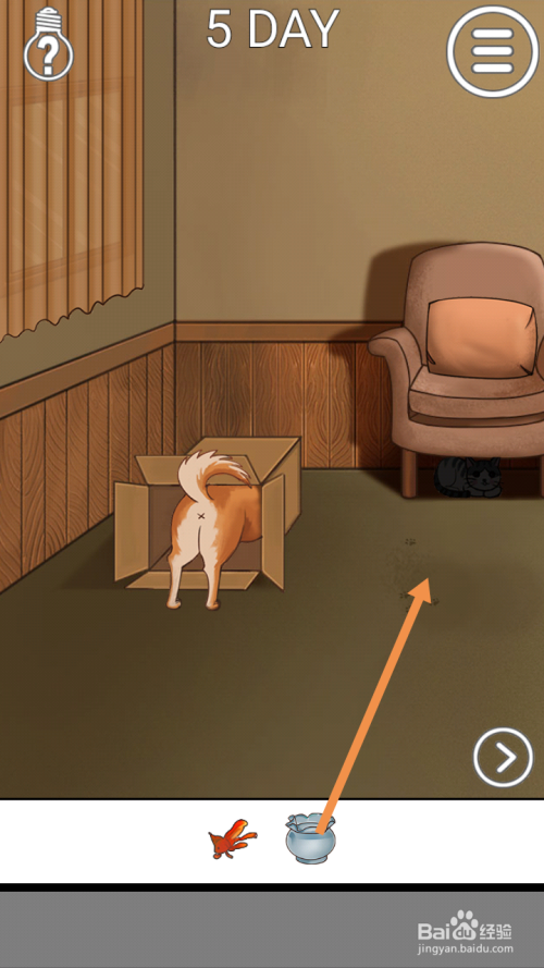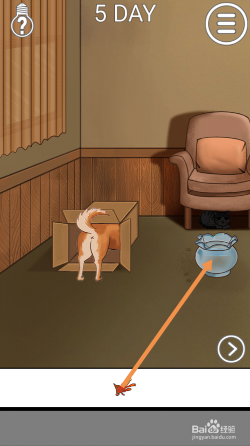 在左边房间里,将鱼缸拖动到地上,然后将鱼拖动到鱼缸旁。