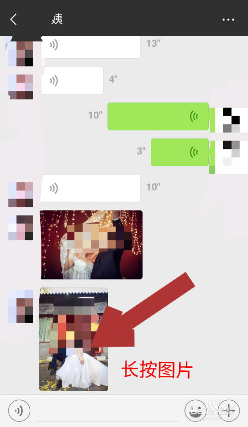 进入与该老友的聊天页面后,找到我们想要发到朋友圈的图片,在聊天页面长按该图片。