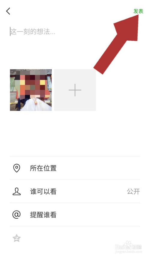 点击分享到朋友圈后,进入朋友圈动态编纂页面,在”这一刻的设法......“处输入我们此刻的表情,输入完当作后,点击页面右上角的“颁发”。