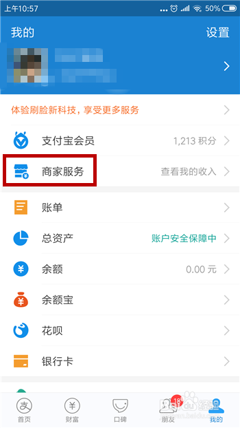 然后在付出宝的小我本家儿页中找到【商家办事】功能并点击打开商家办事。