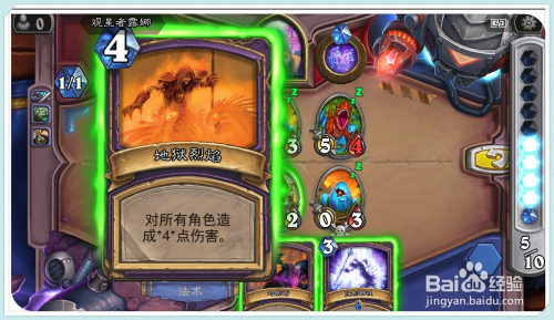 最后,很是关头的步,将手中4费的地狱烈焰牌打出,清空场中全数生命值小于4的侍从,同时激发两个魔暴龙蛋的亡语,敌我两边各留下一个5/5魔暴龙侍从,过关。