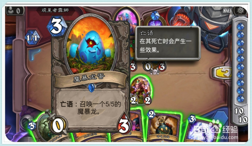 首先,我们来熟悉一下对面的侍从魔暴龙蛋,它有一个亡语结果,就是