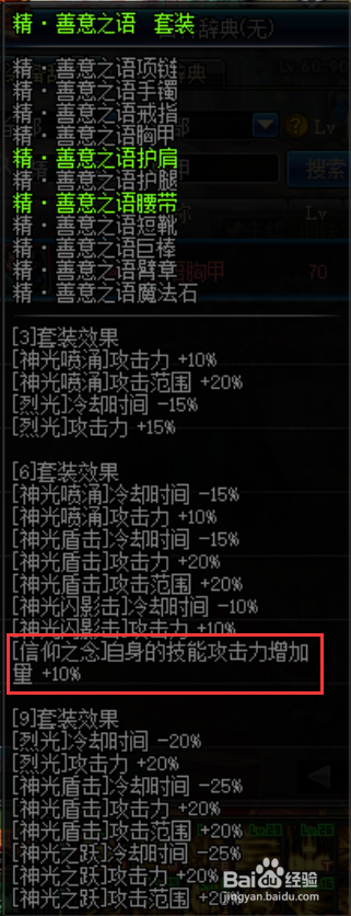 异界装备保举“精·善意之语”6件,(【崇奉之念】自身技术进犯力增添+10%),保举部位头肩、腰带、鞋子、手镯、项链、魔法石。(为了更好的搭配装备)