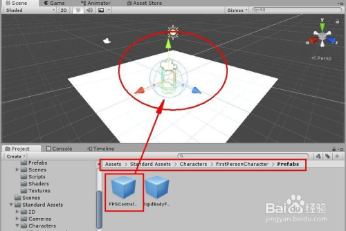 我们导入(Standard Assets)官方尺度资本包(若是没有这个包的到Asset store自行下载),在资本包中按照Asset->Standard Assets->Characters->FirstPersonCharater的路径找到第一人称节制器(如图),并将其拖入场景中作为本家儿角,便利待会不雅察场景。
