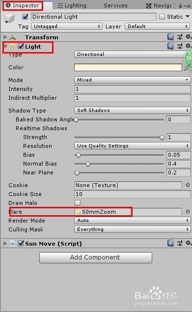 选中偏向光,在检视面板中选择它的light组件,把适才的特效拖进叫做Flare的槽中。