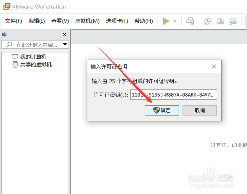 在打开的VMware Workstation 15输入许可证密钥对话框里直接输入25位密钥,然后点击确定,如下图所示。