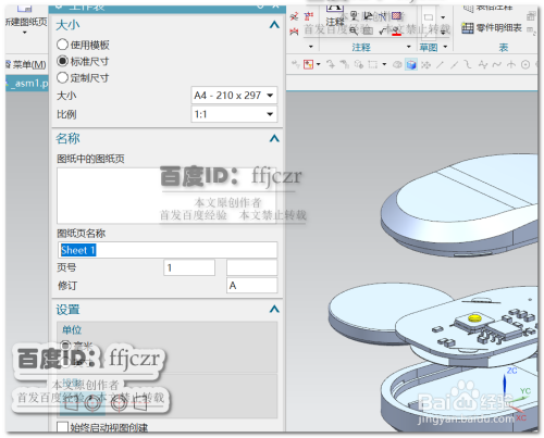 首先进入制图模式,选择新建图纸页,选用可以摆得下所有组件的页面;本次模子较小,利用297*210页面即可。