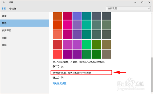 在“颜色”菜单的设置项中,我们直接找到“使开始菜单、使命栏、操作中间变透明”设置项。