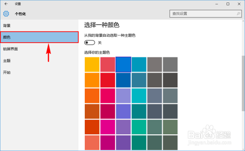 点击“个性化”菜单之后,我们就打开了win10系统的“个性化”设置弹窗,在弹窗里我们选择左侧的“颜色”菜单项。
