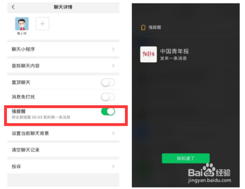 新增“强提醒”功能。在聊天详情页中,可以给单聊设置,该老友发送的动静会直接霸屏显示。