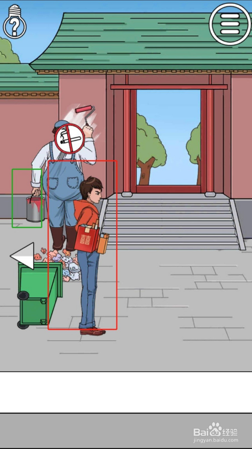 第21关:首先打翻垃圾桶,再标的目的左一页取得卷烟,先把卷烟给粉刷墙面的年夜叔,拿走他的油漆桶给年夜妈。再把卷烟给男本家儿。