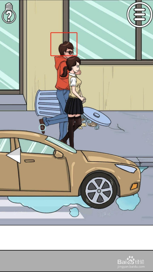 第23关:首先点击消弭男本家儿手上的伞,打翻第二页的垃圾桶。点击“GO”,碰到路人时,取下路人的墨镜给男本家儿