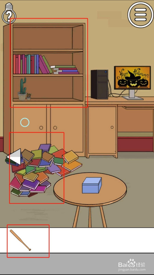 第22关:在第二页点击书架上的书,取下书架上的棒球棍给男本家儿,再开门