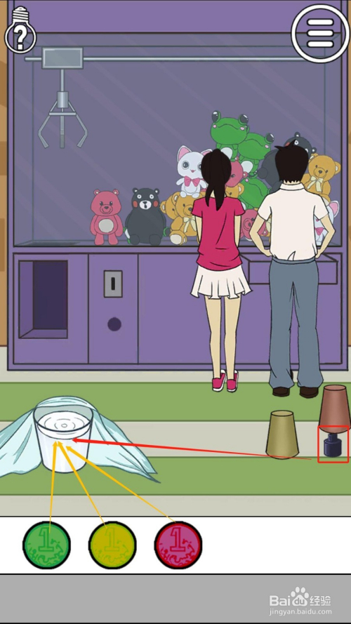 第19关:首先取下墙上、桶上、布下面的三枚硬币,再取到桶下面的黑墨水放到木水桶里。把三枚硬币放到桶里染当作黑色再投到娃娃机里。