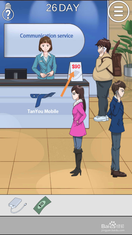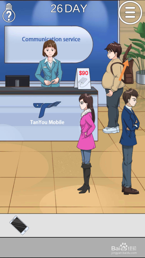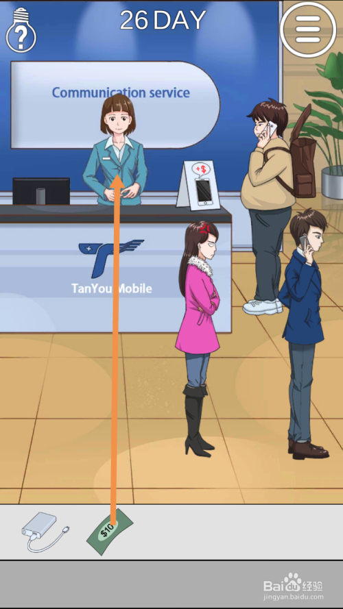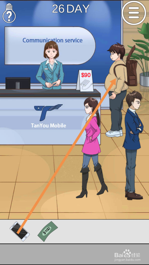 获得钱后,将手机拖动到胖子身上,然后将钱拖动到柜台蜜斯身上。