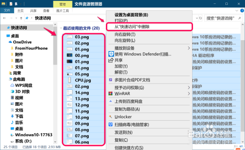 在快速拜候对应的右侧窗口中,我们可以看到【比来利用的文件】下有20个文件,即:快速拜候功能记实下来的拜候记实文件,利用鼠标圈定文件,右键点击,在右键菜单中点击:从 快速拜候 中删除;