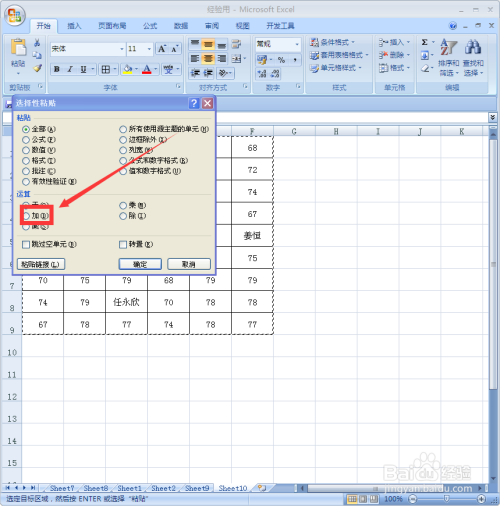 在选择性粘贴对话框,勾选“运算”下面的”加“