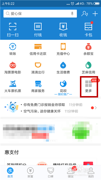 打开了付出宝后在首页上方的保举应用中找到【更多】选项并点击。